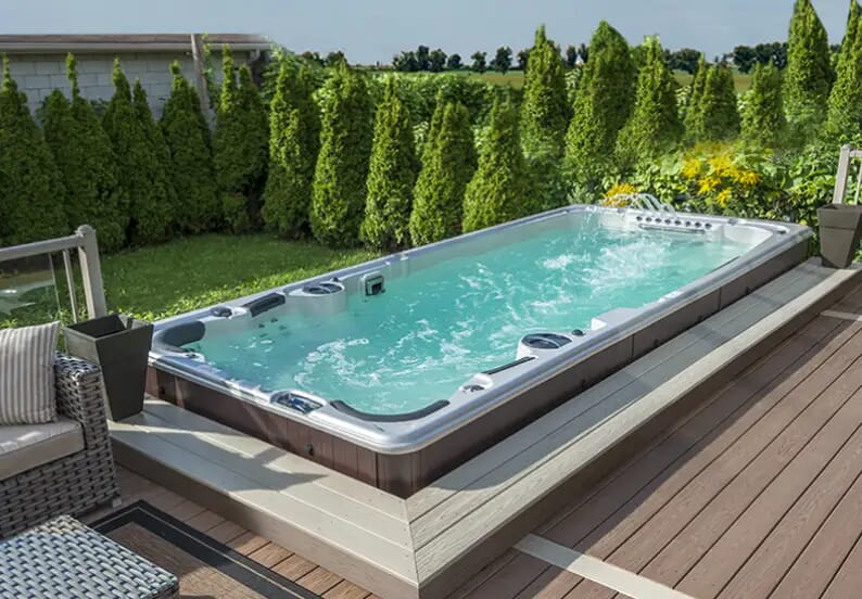 The AquaPlay Swim Spa is the perfect mini pool for family fun. This interactive swim spa has a generous streamlined swim tank area with plenty of seating. You can swim stationary laps for a full-body workout, then relax in the contoured seating and enjoy a massage with the built-in hydrotherapy while the rest of the family stays active. The swim tank floor has an anti-slip grip that allows a variety of fitness routines including jogging in place, BoxFit, or aquatic cross training for a great cardiovascular workout. The AquaPlay Swim Spa comes with a maintenance-free grey Dura finish, and the premium quality cabinetry is embossed with a realistic wood finish.